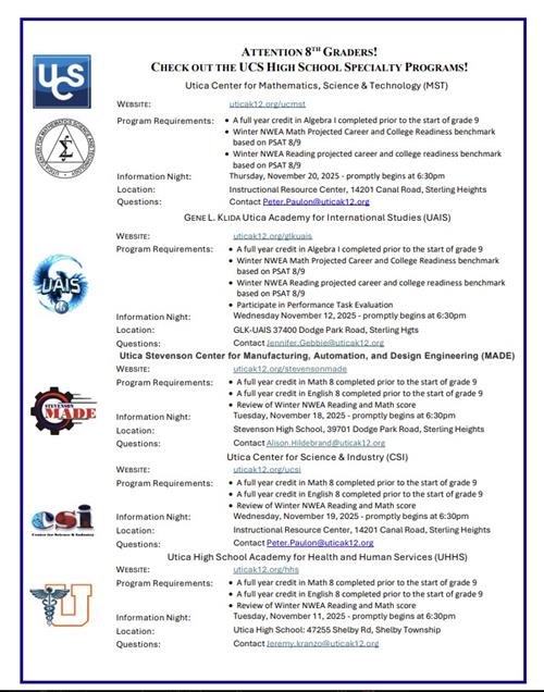 Please take the time to review our 2025-2026 Utica Community Schools Parent and Student Handbook with your child before their first day of school this year. This is an important document outlining policies and procedures that all students must follow during the school day and at school sponsored activities/events.